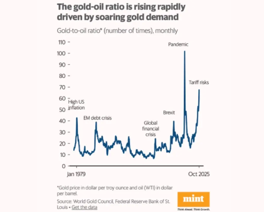 The gold-to-oil ratio has spiked to over 60x in Oct 2025, driven by soaring gold prices amid tariff risks and safe-haven demand, matching highs last seen during the pandemic.